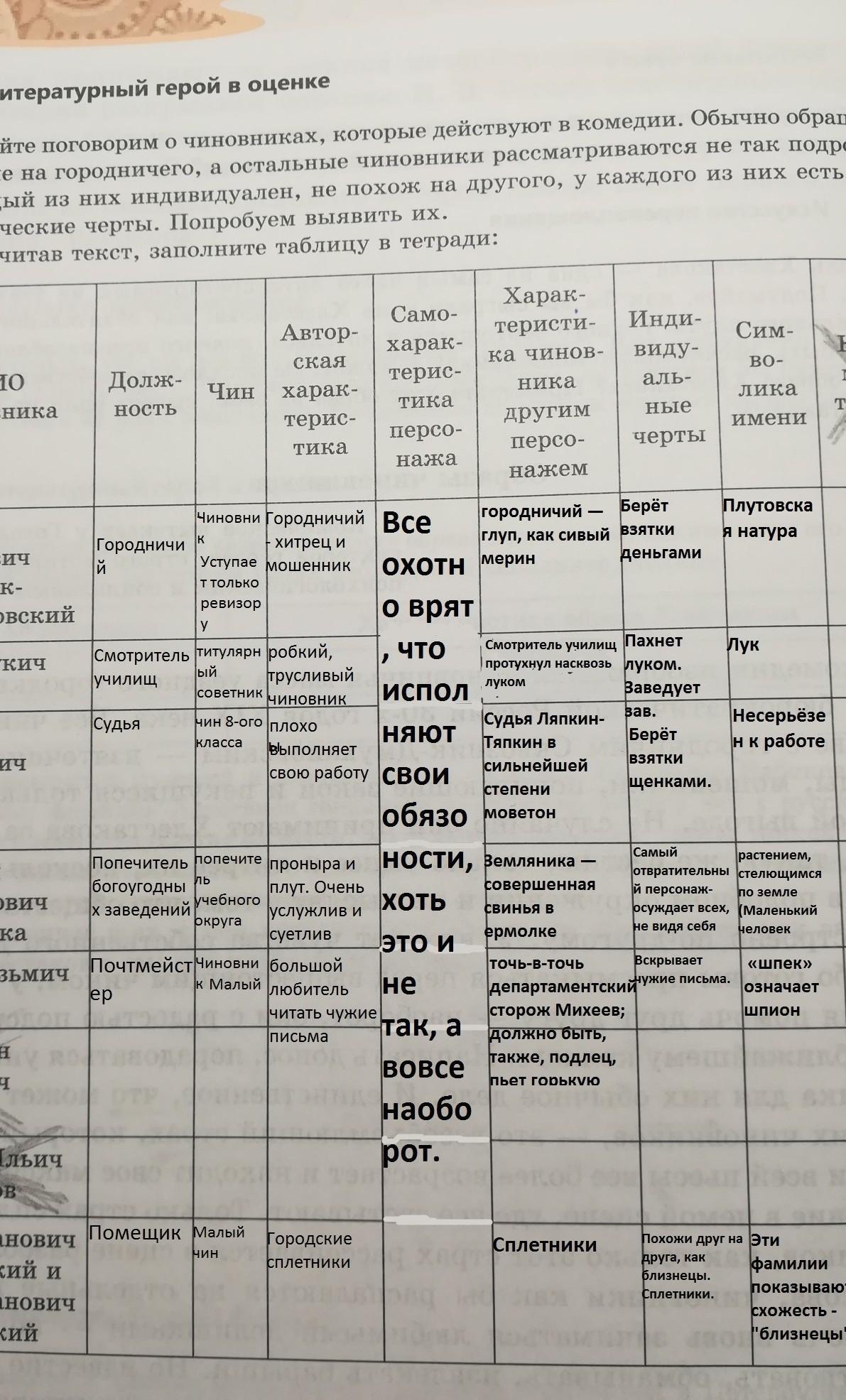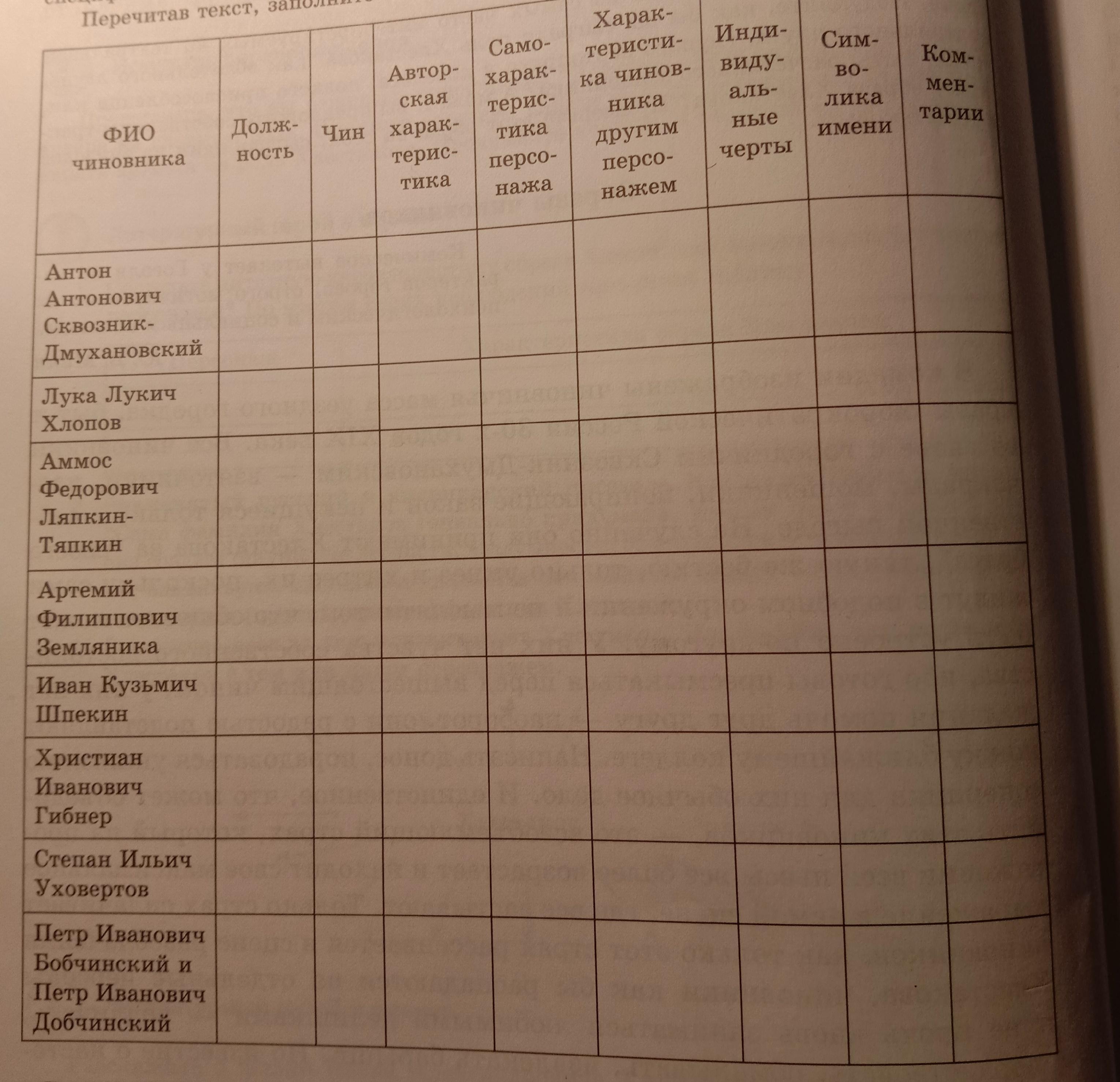 Давайте поговорим о чиновниках, которые действуют в комедии. Обычно обращают внимание на городничего, а остальные чиновники рассматриваются не так подробно. Но каждый из них индивидуален, не похож на другого, специфические черты. Попробуем выявить их. Перечитав текст, заполните таблицу в тетради: каждого из них есть свои.