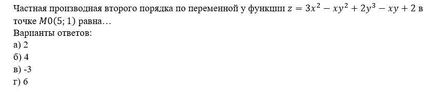 Частная производная второго порядка по переменной y функции z=3x^2-xy^2+2y^3-xy+2 в точке M0(5;1) равна…