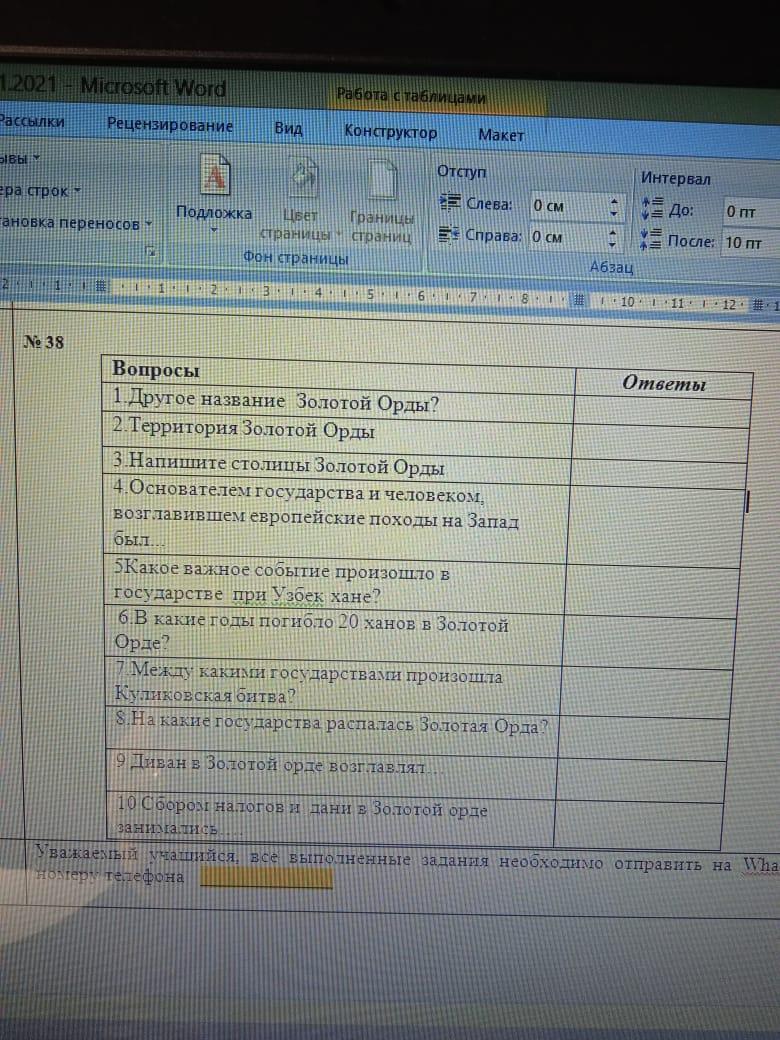 Ответ:1 Улус Джучи 2 Центральная Евразия, 3 Сарай 4 Батый 5 принятие ислама 6 1357~1380 7 Великое Литовское княжество, Золотая орда, московское княжество. 8 Астраханское, казанское ханство, ногайская орда 9 хан 10 баскаки.