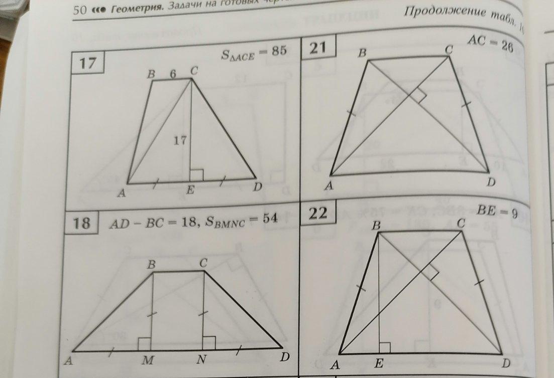 СРОЧНО НА ЗАВТРА!!! помогите пожалуйста, в номере 17 и 22 надо найти ПЛОЩАДЬ ТРАПЕЦИИ, помогите пожалуйста