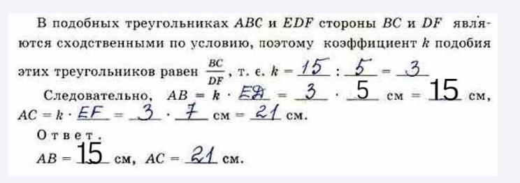 треугольник ABC подобный треугольнику ЕDF. Найдите AB и AC, если ED = 5 см; DF = 5 см, EF = 7 см,