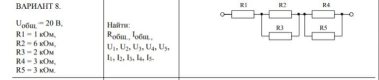 Найти U1,U2,U3,U4,5 ; I1,I2,I3,I4,I5 . R общее = 4000 Ом, Iобщее=0,005 А .