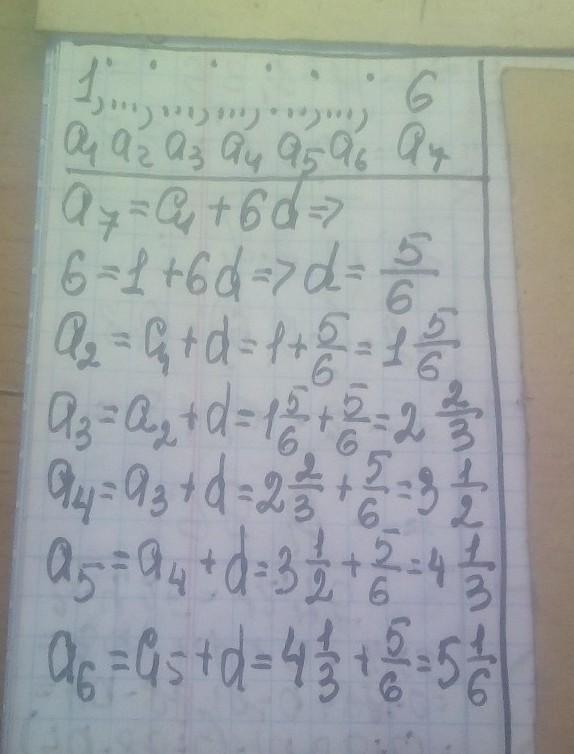 Между числами 1 и 6 найдите пять чисел, которые вместе с заданными числами являются последовательными членами арифмитической прогрессии