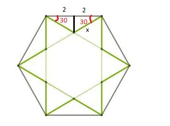 Треугольник образованный двумя соседними сторонами шестиугольника и диагональю равнобедренный, а значит углы при основании равны: (180° - 120°)/2 = 30°. Обозначим красным углы по 30° в двух таких соседних равнобедренных треугольниках (смотрите рисунок). Таким образом, мы рассматриваем новый равнобедренный треугольник с красными углами при основании и основанием в виде стороны данного многоугольника длиной 4 см. Проведем на его основание высоту, она же и медиана, что делит стороны многоугольника пополам на два отрезка длинной 2 см.