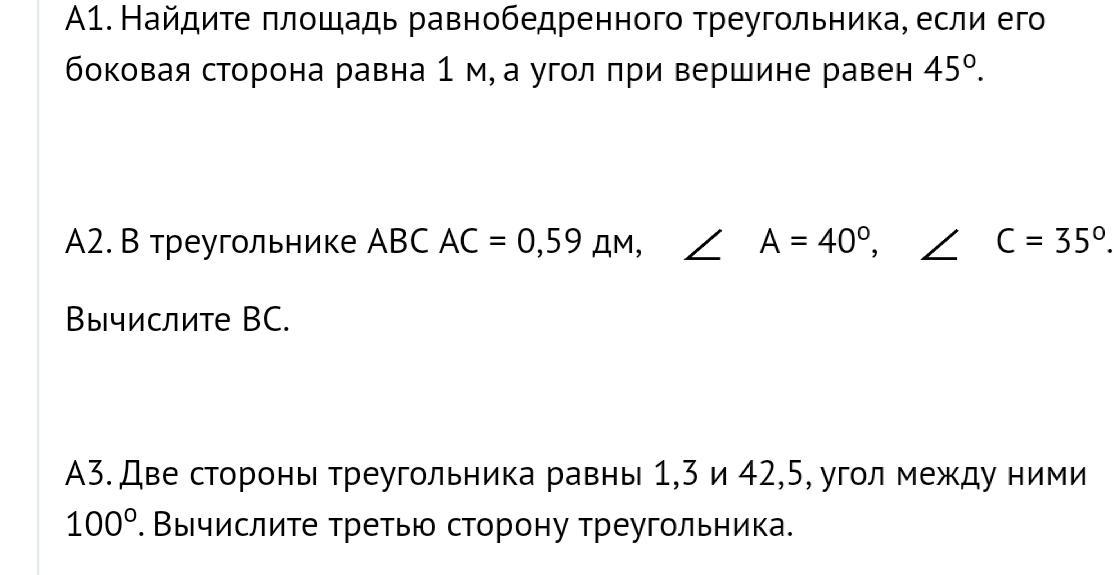 А2. Треугольник этот равнобедренный, следовательно угла при основании равны, следовательно угол A равен углу С, наверно потом надо 0,59 дм умножить на два, это и будет угол ВС