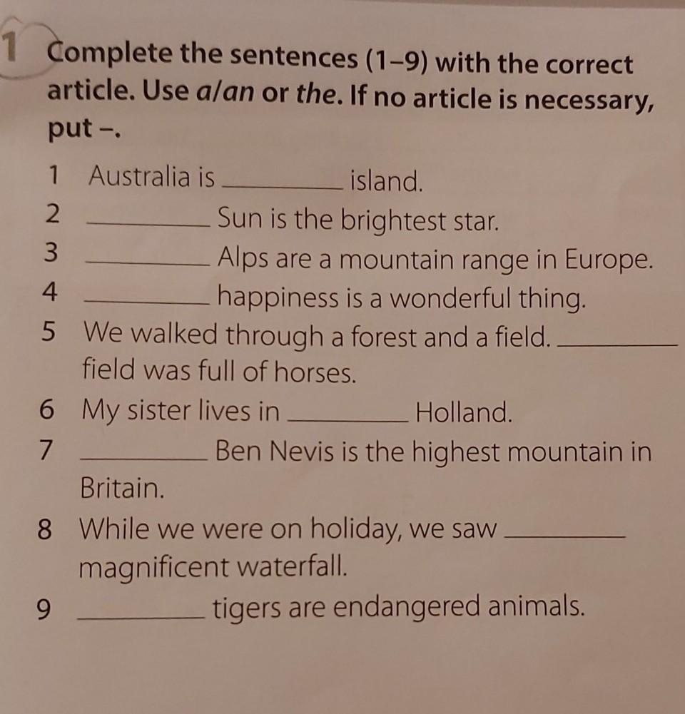 Complete the sentences(1-9) with the correct article. Use a/an or the. If no article is necessary, put -.