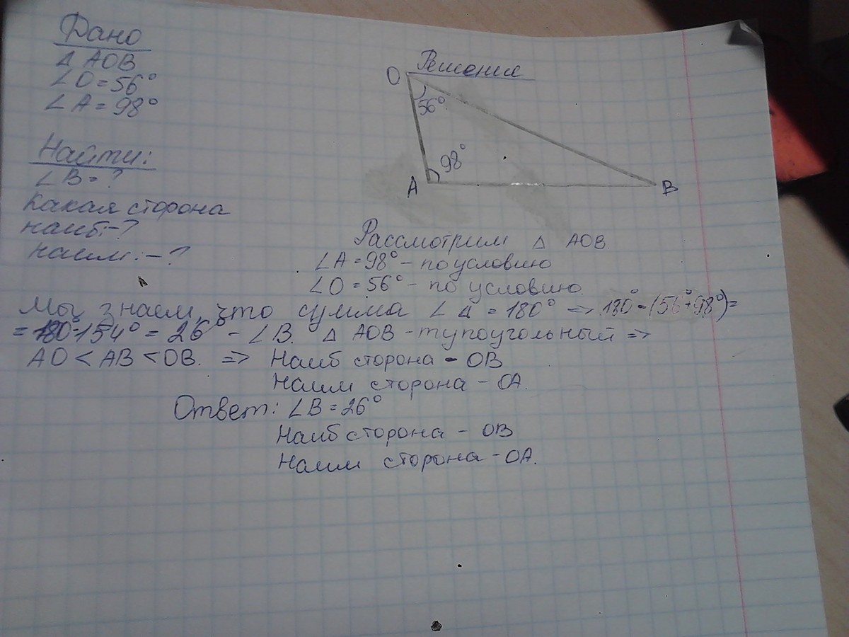 В треугольнике АОВ угол О=56 градусосов,угол А=98 градусов;найти угол В.Какая сторона треугольника АОВнаибальшая ,а какая наименьшая.