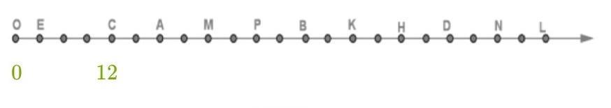 Запиши координату точки P, изображённой на рисунке. Если координата точки O(0), а координата точки C(12).