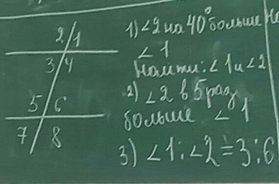 1) Пусть х – угол 1, тогда х+40 – угол 2. Т.к. смежный угол равен 180°; имеем уравнение: