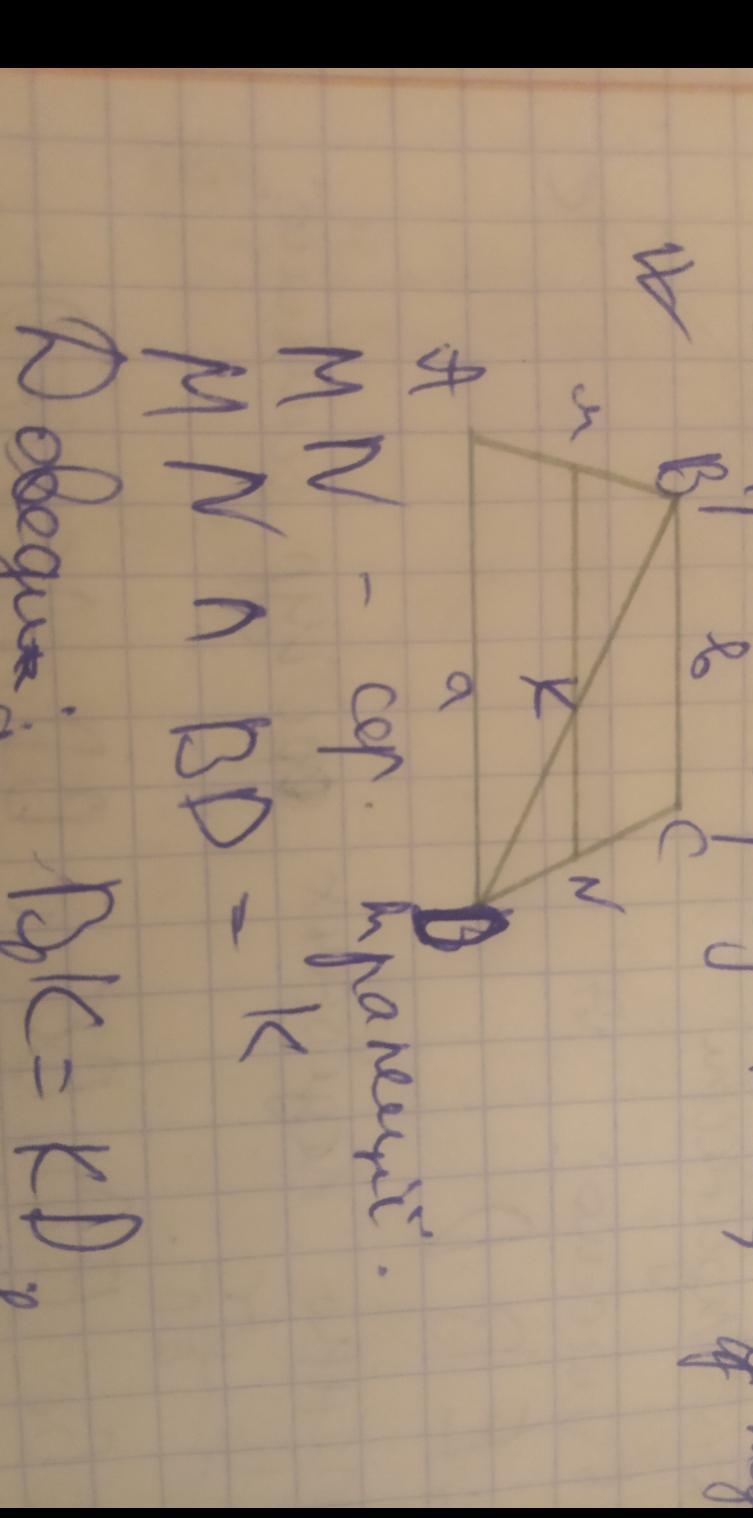точка М делит сторону АВ пополам, MN перескает BD, а значит и диагональ BD разделена на два равных отрезка