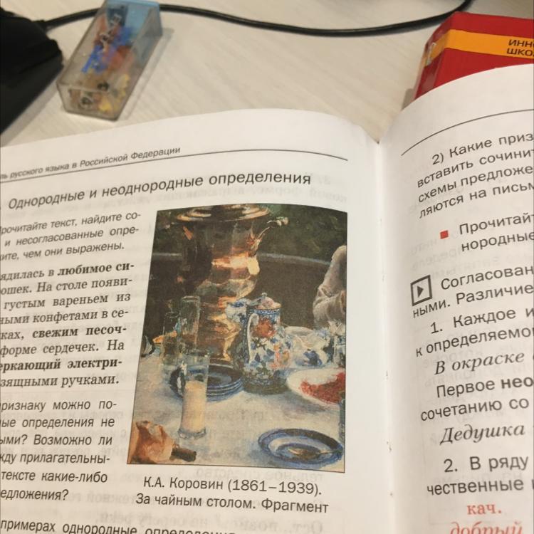 На картине К.А. Коровина изображен кухонный столик. На нем стоит самовар, сахарница и тарелки, с супом. Эта картина выполнена в холодных тонах, что делает её в моих глазах более красивой, нежели в теплых. На переднем плане хочу отметить пустую тарелку и стакан, как я понял(а) с молоком. На заднем фоне изображён самовар, сахарница, тарелка с борщем, а также мы видим часть руки человека. Эта картина мне очень понравилась, т.к. напоминает мне о теплых летних вечерах и сделана, эта картина в холодных оттенках, что выглядит очень привлекательно.