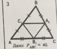 2. Р А1В1С1 = А1В1 + В1С1 + А1С1 = 1/2•АВ + 1/2•ВС + 1/2•АС = 1/2•(АВ + ВС + АС) = 1/2• Р АВС = 1/2 • 40 = 20.