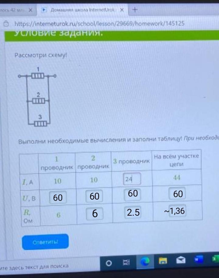 Последнюю колонку мы можем заполнить двома способами, с помощью того же закона Ома, так как общий ток в цепи и напругу мы знаем, а можна с помощью ф-лы для вычисления общего сопротивления проводников, выглядит она так:
