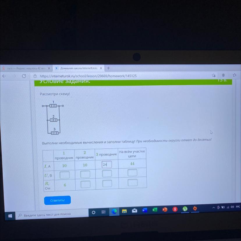 Чтобы найти напряжения в цепи, нам надо найти произведения тока и сопротивления, которые даны вам в первой колонке, это действия выполняется исходя из закона Ома.