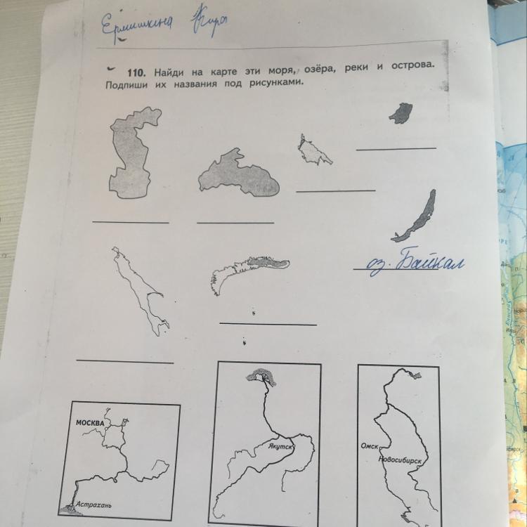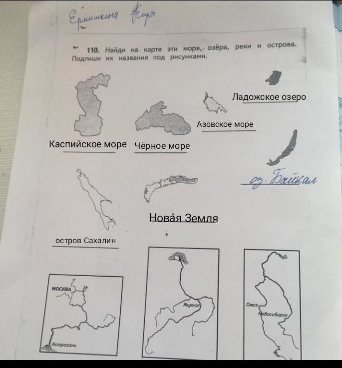 Найди на карте эти моря, озера, реки и острова. Подпиши их названия под рисунками.