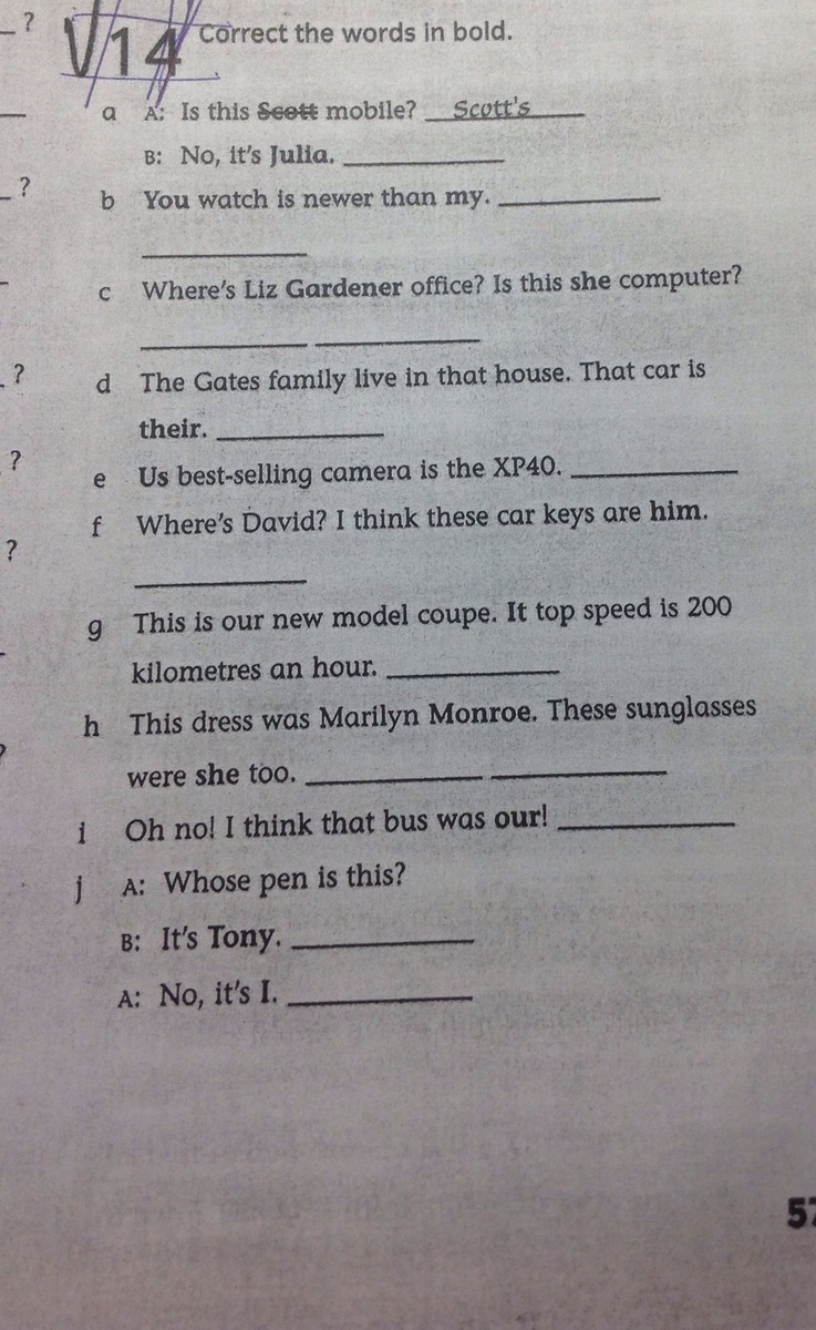 14 a Julia’s b Your, mine c Gardener’s, her d theirs e Our f his g Its h Monroe’s, hers i ours j Tony’s, mine