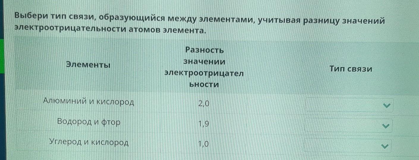 Выбери тип связи, образующийся между элементами, учитывая разницу зн