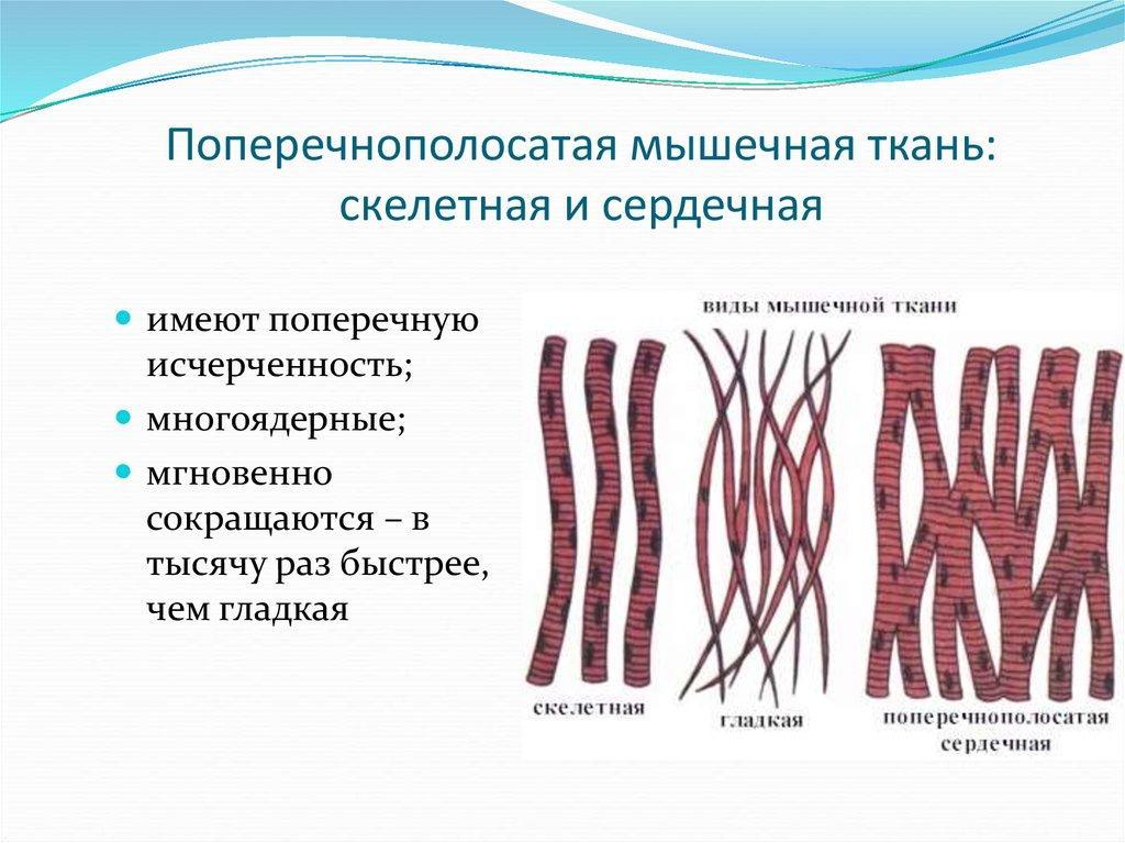 Ее волокна многоядерные, так как образуются при слиянии клеток и имеют поперечную исчерченность. Сокращаются быстро и произвольно.
