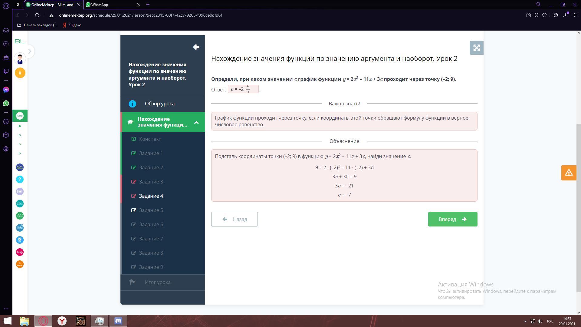 Определи, при каком значении c график функции y = 2x2 – 11x + 3c проходит через точку (–2; 9).