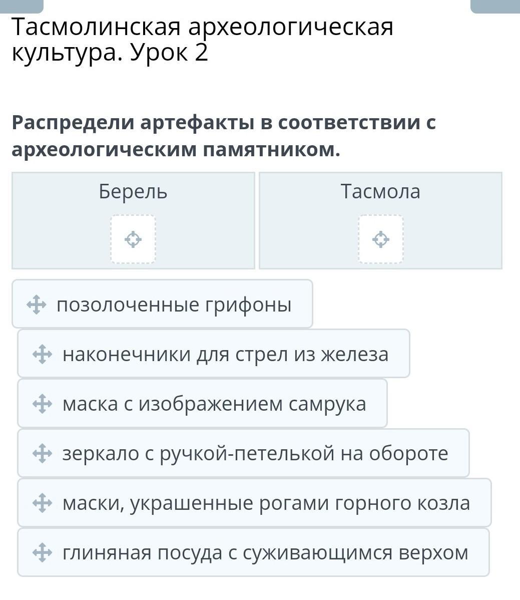 Распредели артефакты в соответствии с археологическим памятником помогите