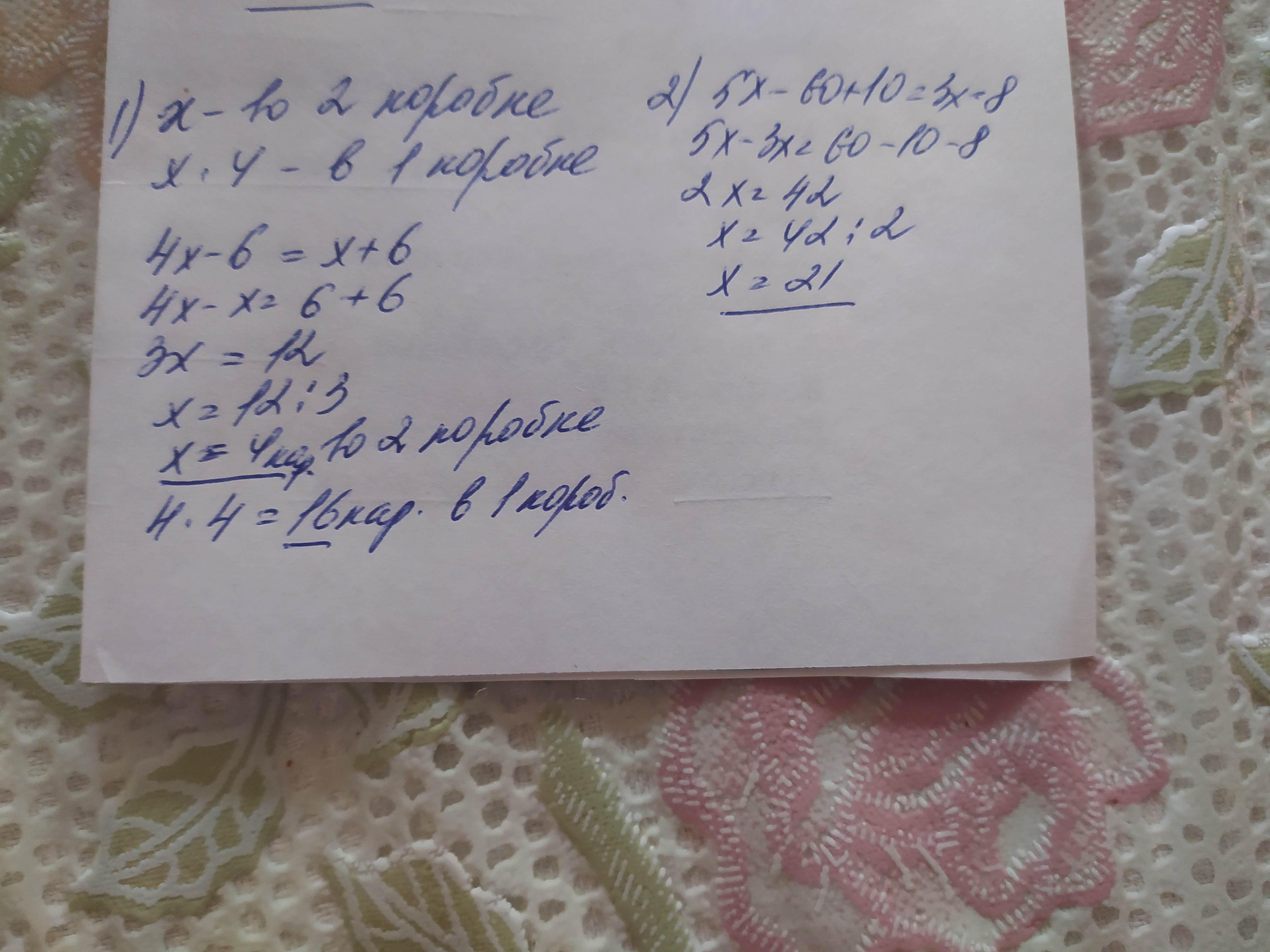 В двух коробках лежат карандаши.В 1ой коробке карандашей в 4 раза больше, чем во 2ой. Когда из 1ой коробки переложили 6 карандашей во вторую, то количество карандашей в двух коробках стало одинаковым.Сколько карандашей было в каждой коробке первоначально?
