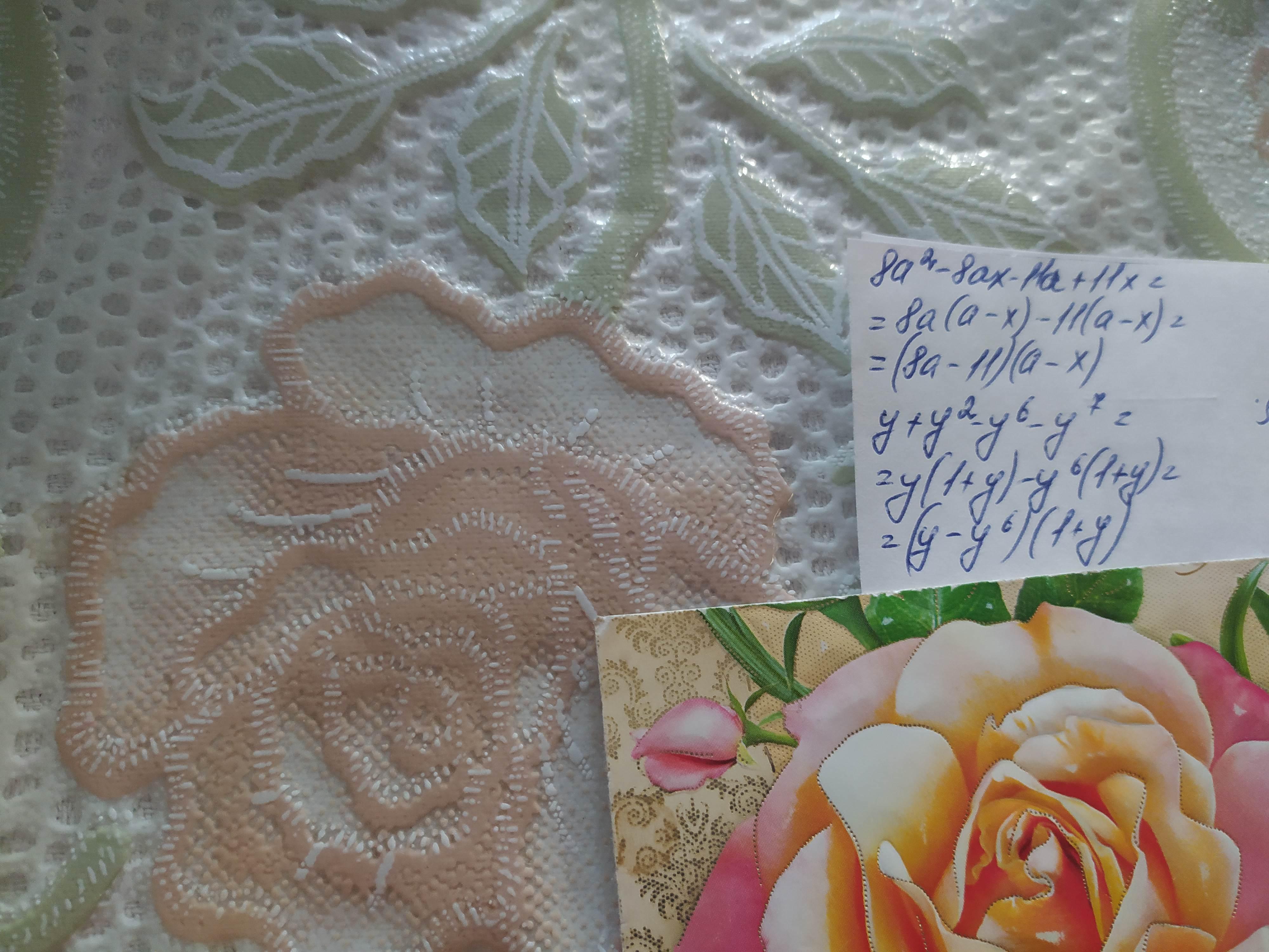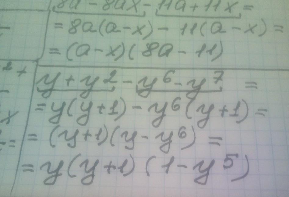 Разложите на множители способом группировки.1)8а в квадрате-8ах -11а+11х. 2)у+у в квадрате-у в шестой -у в седьмой