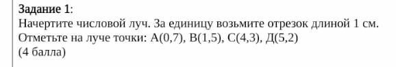 Начертите числовой луч. за единицу возьмите о резок длиной 1 см. Отметьте на луче точки А(0.7) В(1.5) С(4.3) D(5.2)
