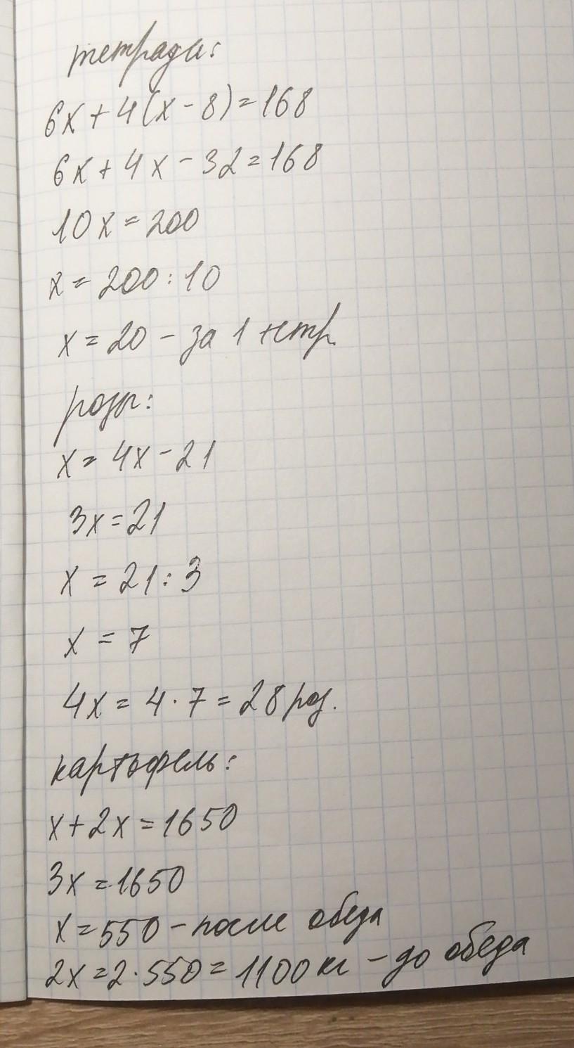 а. Асель купила 6 тетрадей по х тенге, а Карина – 4 тетради по цене на 8 тенге дешевле. Найди цену тетрадей, если известно, что девочки вместе заплатили 168 тенге.