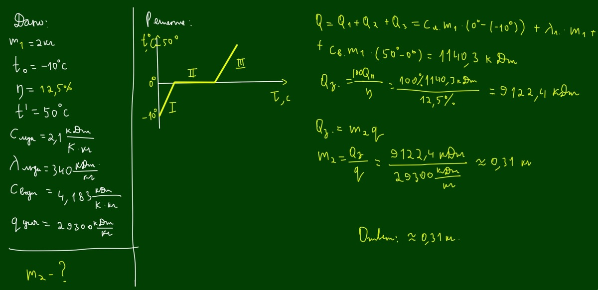 Сколько потребуется каменного угля, чтобы расплавить и превратить в воду 2 кг льда, если начальная температура его минус 10*С , а КПД установки =12.5%?Конечная температура воды 50*С. Полностью напишите решение.