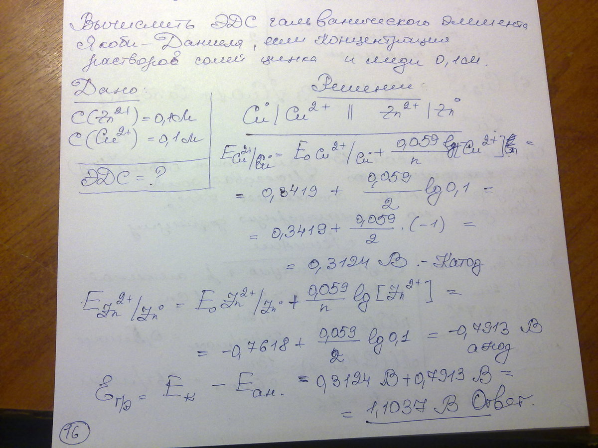 Вычислить значение эдс гальванического элемента якоби-даниэля, если концентрация растворов цинка и купрума =0,1