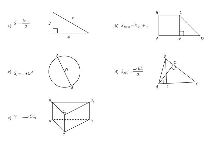 Дополните выражения для расчета площади заданных форм или объемов геометрических тел!
