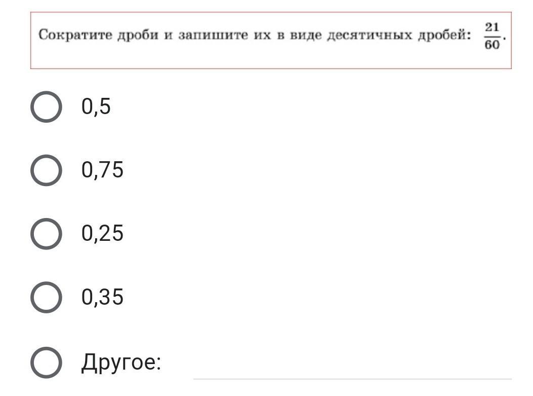 Пошаговое объяснение: 21/60=21÷60=0,35.