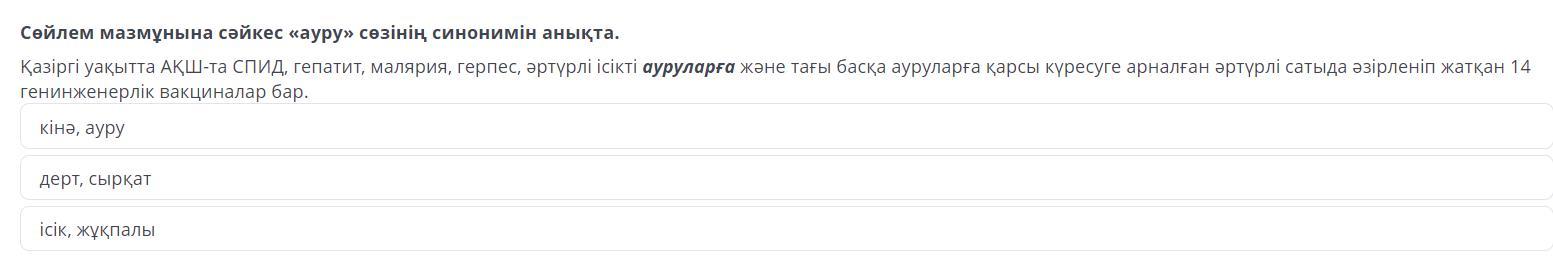 Сөйлем мазмұнына сәйкес «ауру» сөзінің синонимін анықта. Қазіргі уақытта АҚШ-та СПИД, гепатит, малярия, герпес, әртүрлі ісікті ауруларға және тағы басқа ауруларға қарсы күресуге арналған әртүрлі сатыда әзірленіп жатқан 14 генинженерлік вакциналар бар.