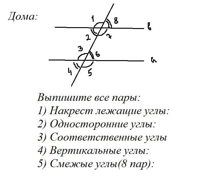 Смежные углы: ∠1 и ∠8; ∠8 и ∠7; ∠7 и ∠2; ∠2 и ∠1; ∠3 и ∠6; ∠6 и ∠5;