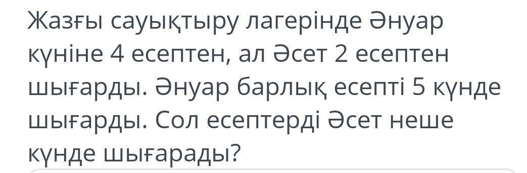 Жауабы: Əсет 10 күнде барлық есепті шығарады.