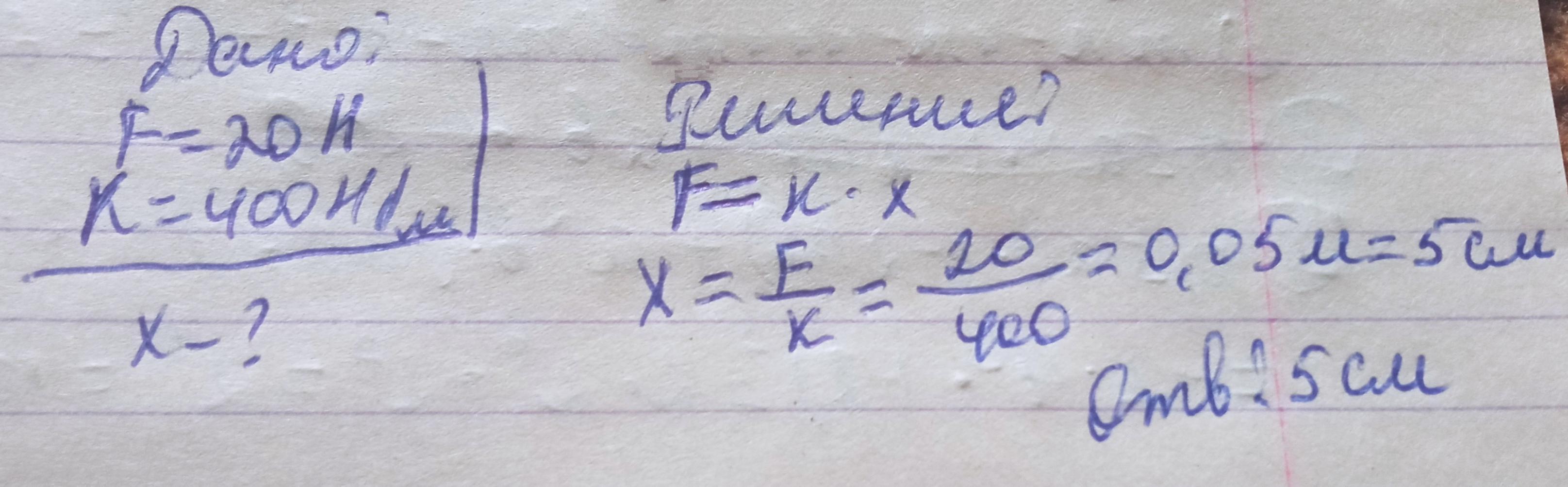На скільки зменшиться довжина пружини , якщо її стискати силою 20 Н? Жорсткість пружини становить 400Н/м.