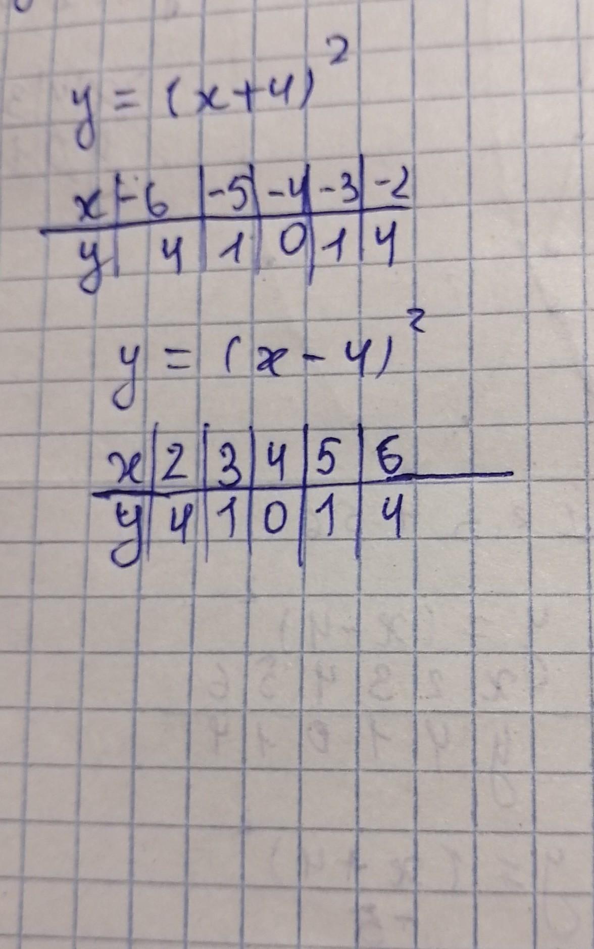 сравните два графика y=(x+4)^2 и y=(x-4)^2 по таблице. ПОЖАЛУЙСТА СРОЧНО СРОЧНО. Алгебра. ДАМ МНОГО БАЛЛОВ, ПОМОГИТЕ ПОЖАЛУЙСТА