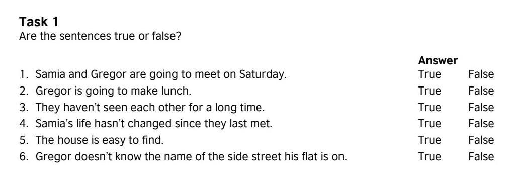 помагите пжжжжж30 баловReading text: An email from a friend Hi Samia, Quick email to say that sounds like a great idea. Saturday is better for me because I'm meeting my parents on Sunday. So if that's still good for you, why don't you come here? Then you can see the new flat and all the work we've done on the kitchen since we moved in. We can eat at home and then go for a walk in the afternoon. It's going to be so good to catch up finally. I want hear all about your new job! Our address is 52 Charles Road, but it's a bit difficult to find because the house numbers are really strange here. If you turn left at the post office and keep going past the big white house on Charles Road, there's a small side street behind it with the houses 50-56 in. Don't ask me why the side street doesn't have a different name! But call me if you get lost and l'll come and get you. Let me know if there's anything you do/don't like to eat. Really looking forward to seeing you! See you soon! Gregor