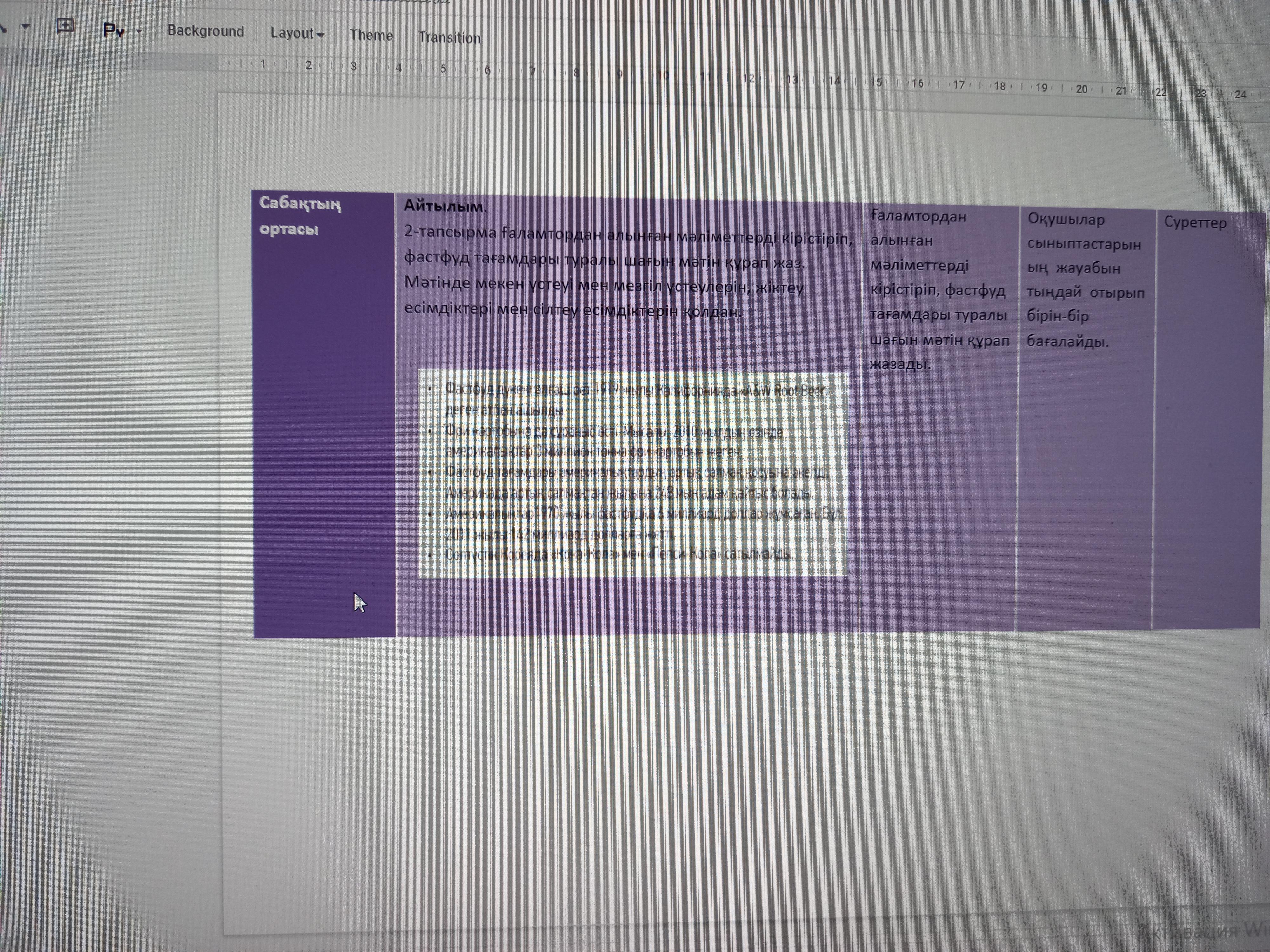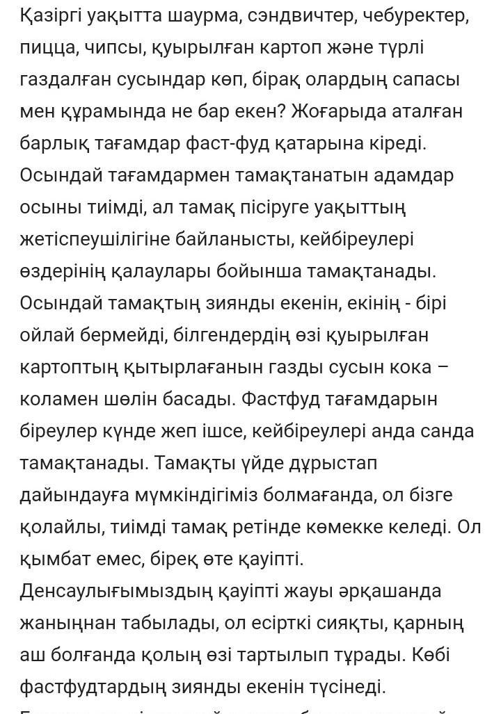 2-тапсырма Ғаламтордан алынған мәліметтерді кірістіріп, фастфуд тағамдары туралы шағын мәтін құрап жаз. Мәтінде мекен үстеуі мен мезгіл үстеулерін, жіктеу есімдіктері мен сілтеу есімдіктерін қолдан.