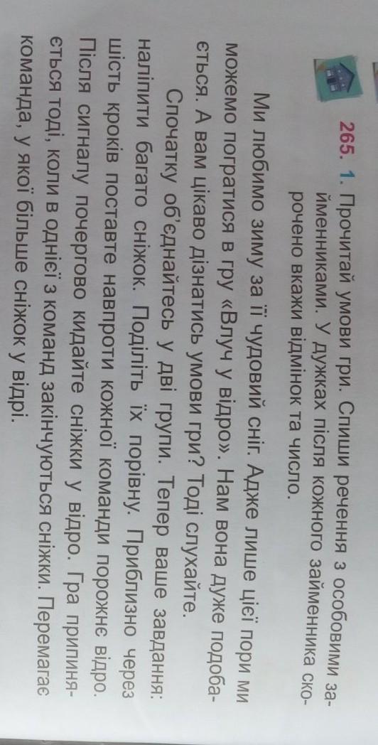 265. 1. Прочитай умови гри. Спиши речення з особовими за йменниками. У дужках після кожного займенника ско рочено вкажи відмінок та число. Ми любимо зиму за її чудовий сніг. Адже лише цієї пори ми можемо погратися в гру «Влуч у відро». Нам вона дуже подоба ється. А вам цікаво дізнатись умови гри? Тоді слухайте. Спочатку об'єднайтесь у дві групи. Тепер ваше завдання: наліпити багато сніжок. Поділіть їх порівну. Приблизно через шість кроків поставте навпроти кожної команди порожне відро. Після сигналу почергово кидайте сніжки у відро. Гра припиня ється тоді, коли в однієї з команд закінчуються сніжки. Перемагає команда, у якої більше сніжок у відрі.