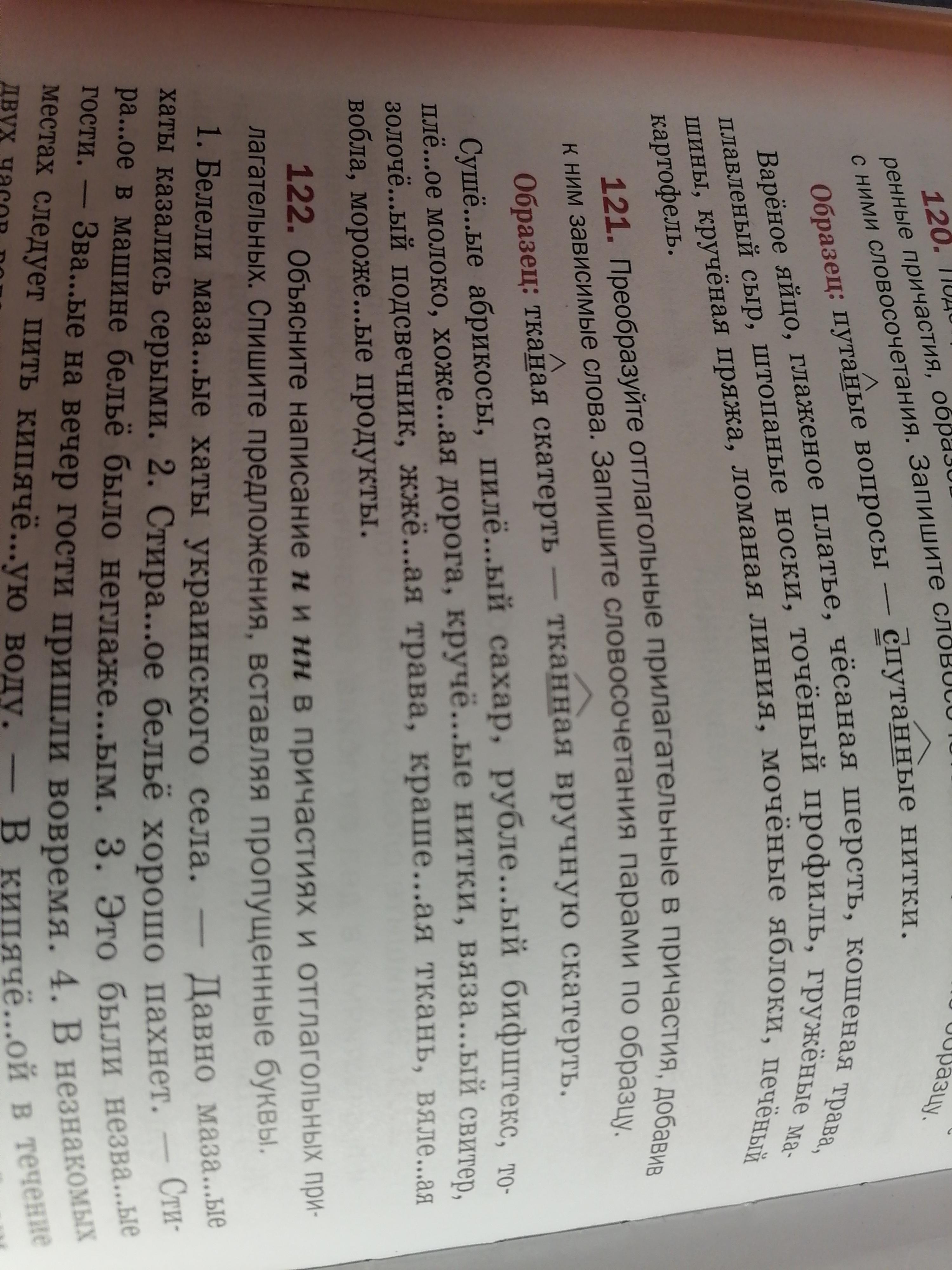 сушенные на солнце абрикосы, пиленный ножовкой сахар, рубленный ножом бифштекс, топленное в домашних условиях молоко, хоженная жителями деревни дорога, крученные для обработки швов нити, вязанный сестрой свитер, золоченный специалистом подсвечник, жженная пастухами трава, крашенная мастером ткань, вяленная отцом рыба, мороженные на рынке продукты.