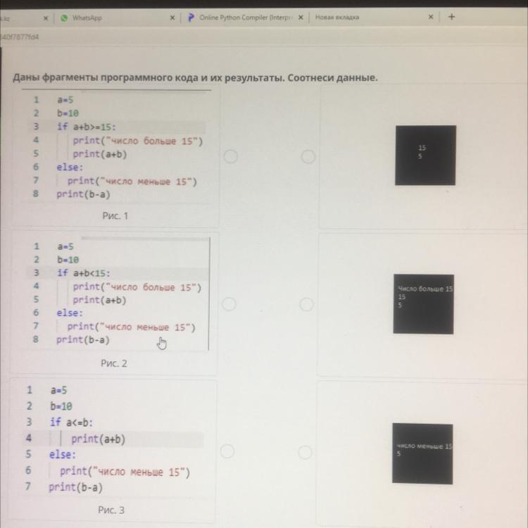 Даны фрагменты программного кода и их результаты. Соотнеси данные.