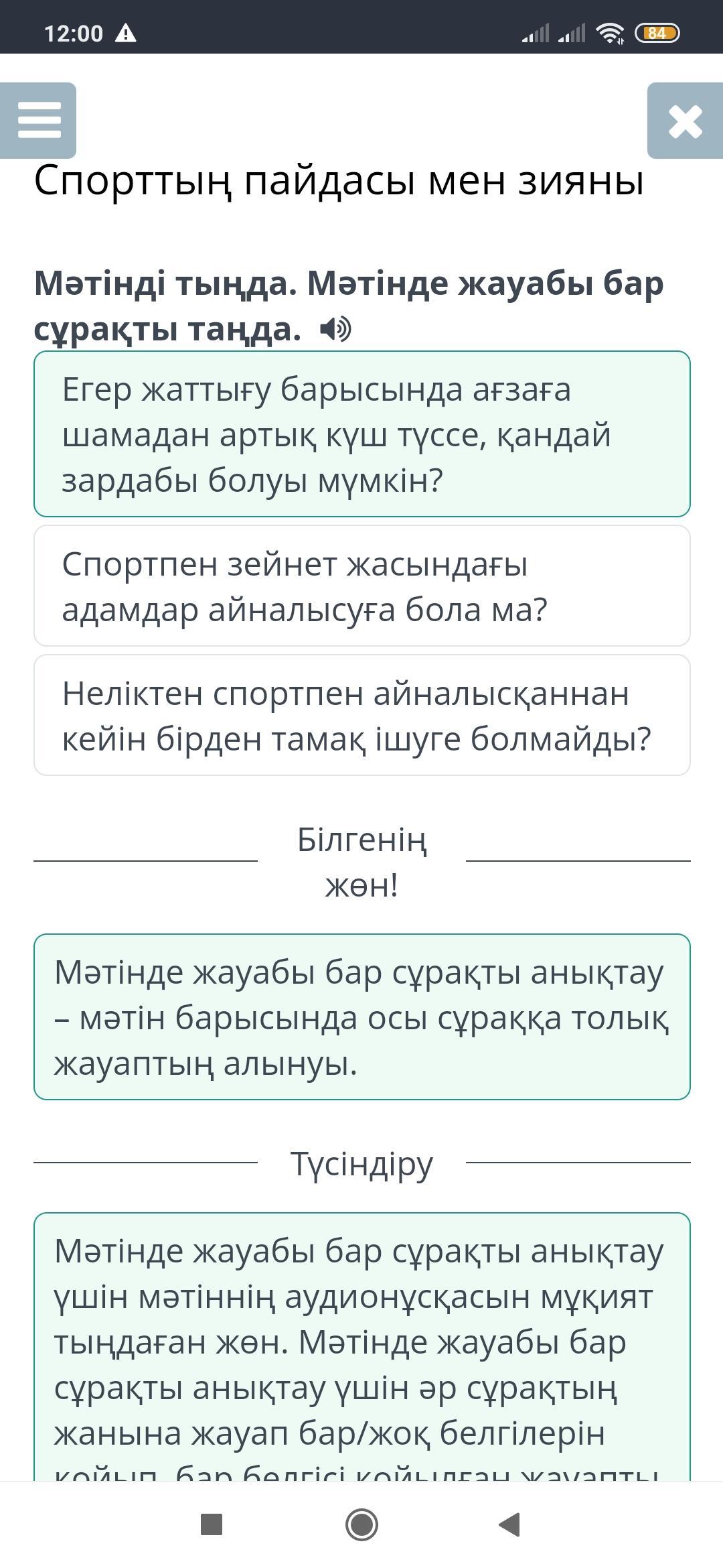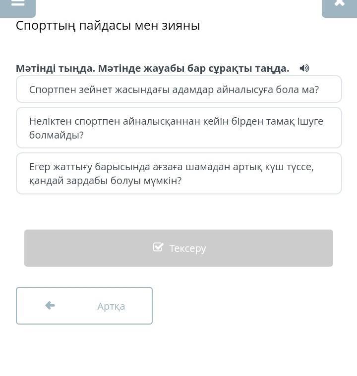 Мәтінді тыңда. Мәтінде жауабы бар сұрақты таңда.