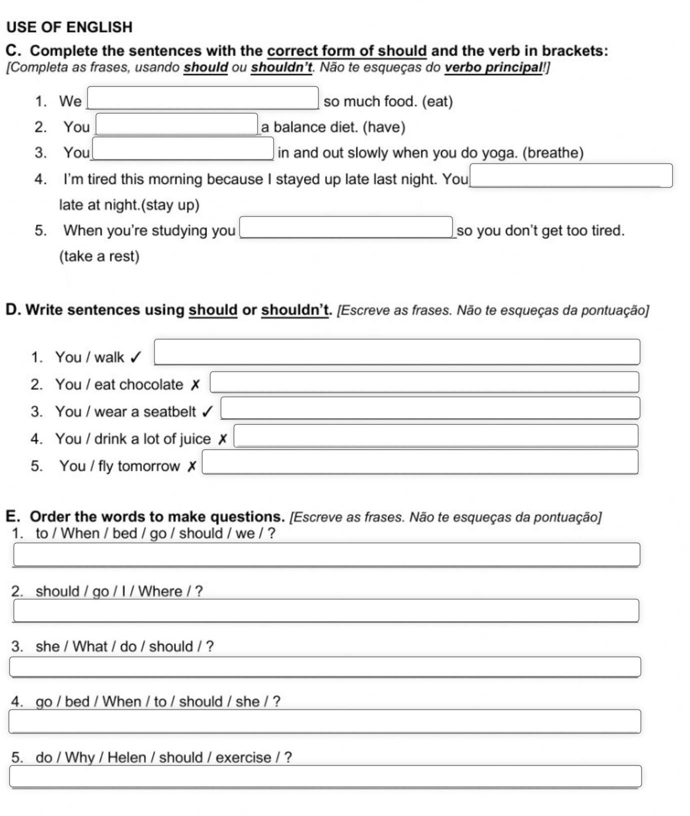 4. I'm tired this morning because I stayed up late last night. You shouldn't stay up late at night.