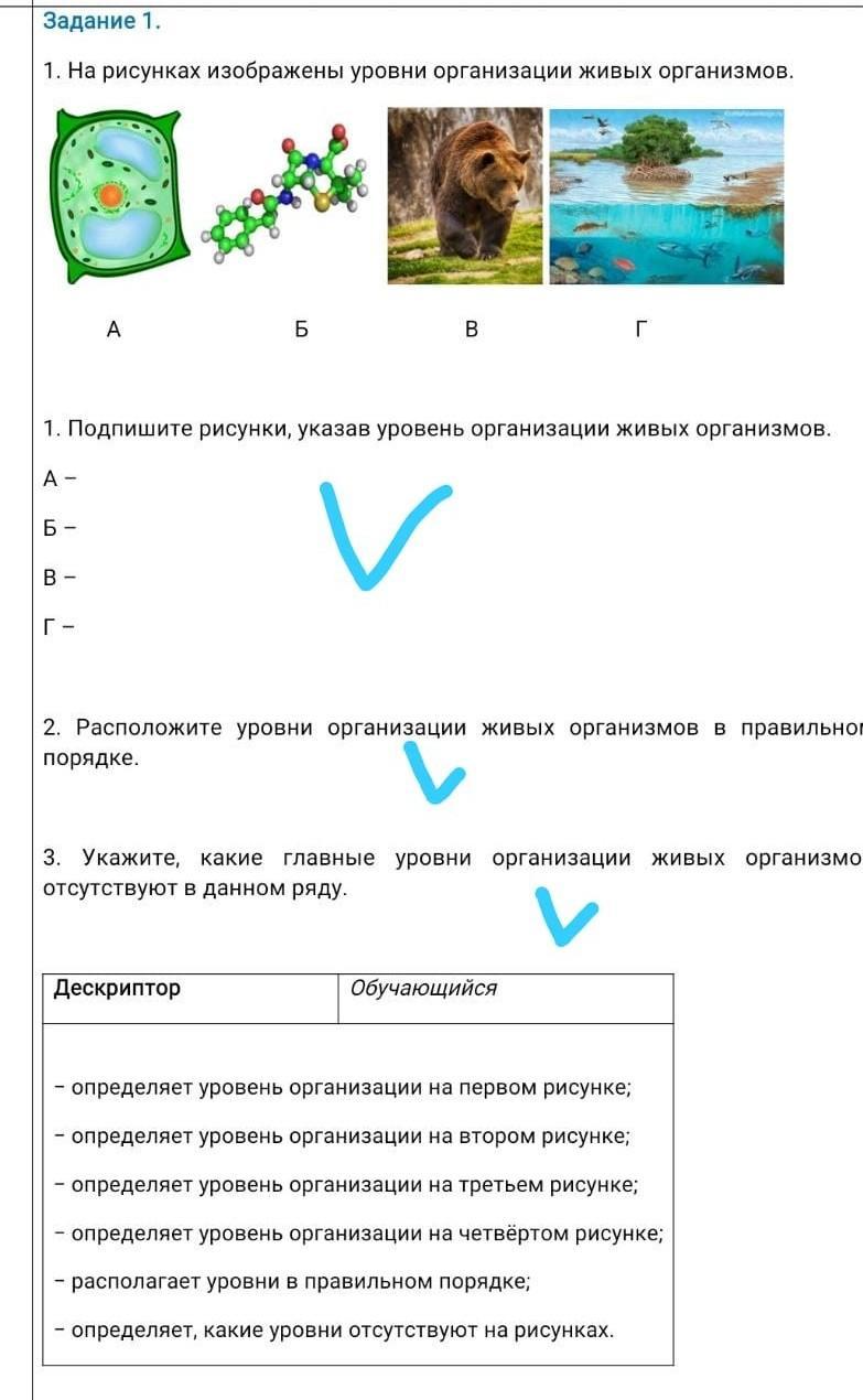 1. А-клеточный; Б-молекулярный; В-организменный; Г-биогеоценозный.