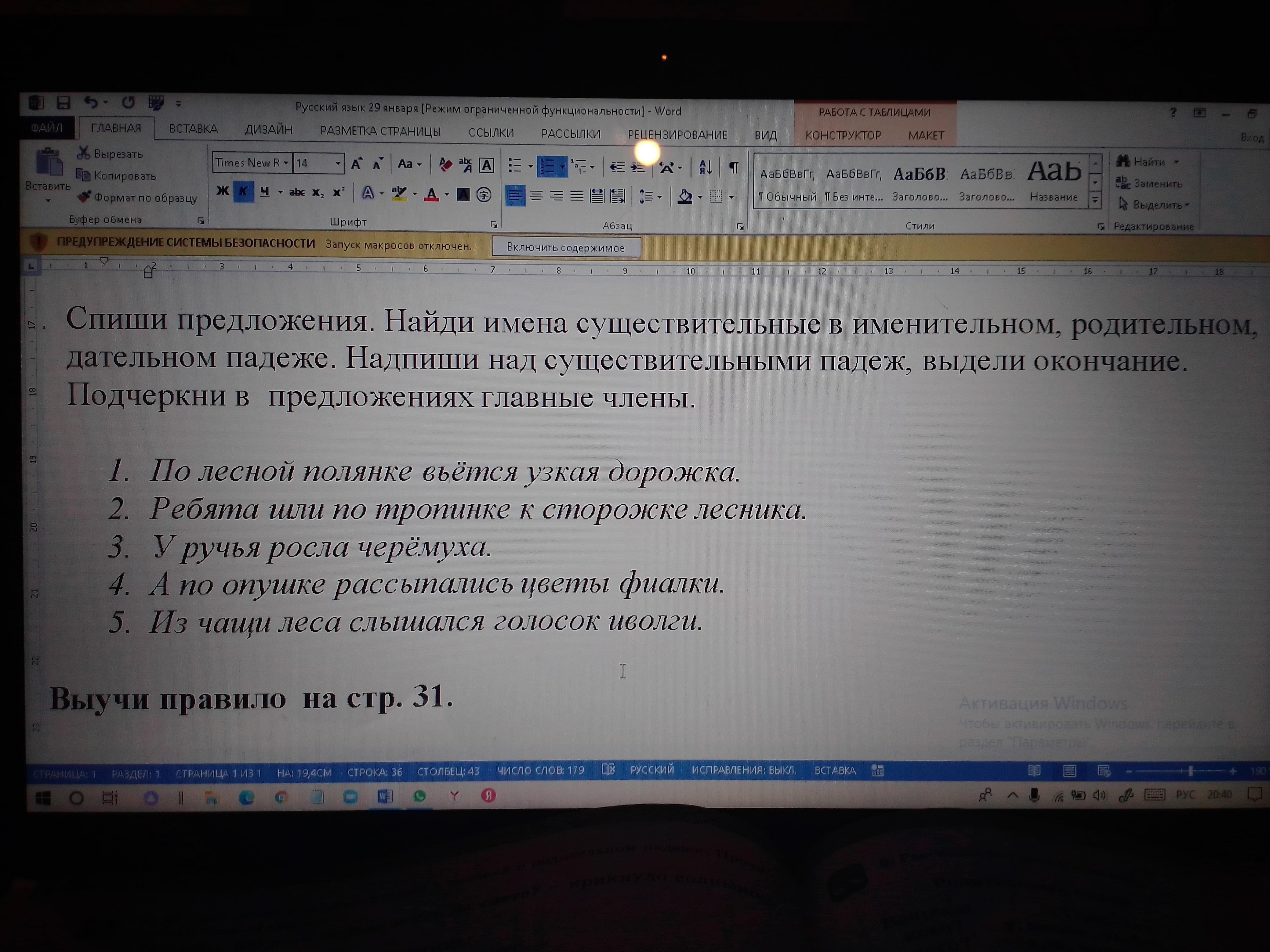ручья - род. п. лесника - род.п. тропинке-дат.п. ребята-им.п. дорожка-дат.п черемуха - имен.п. опушке-пред.п. цветы - имен.п фиалки - имен.п.