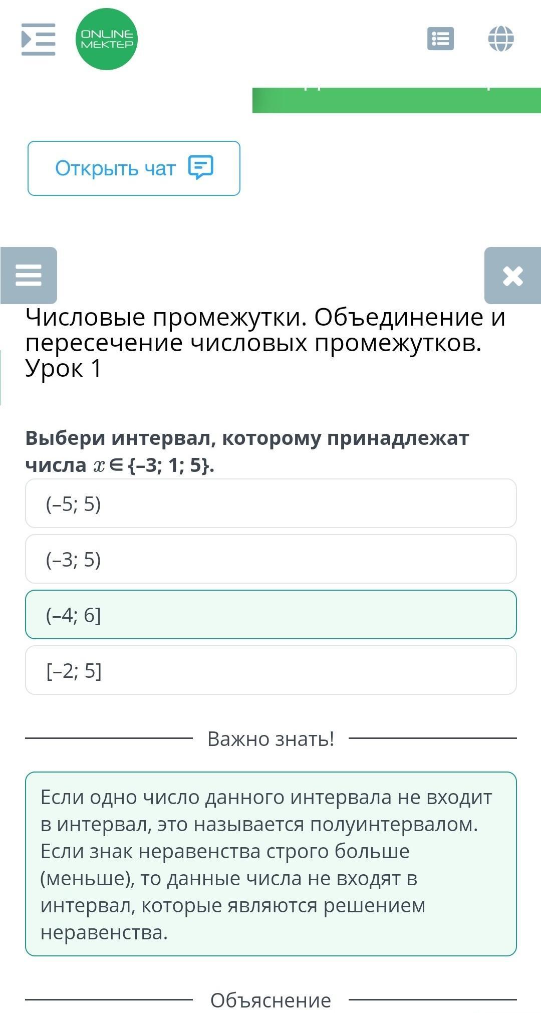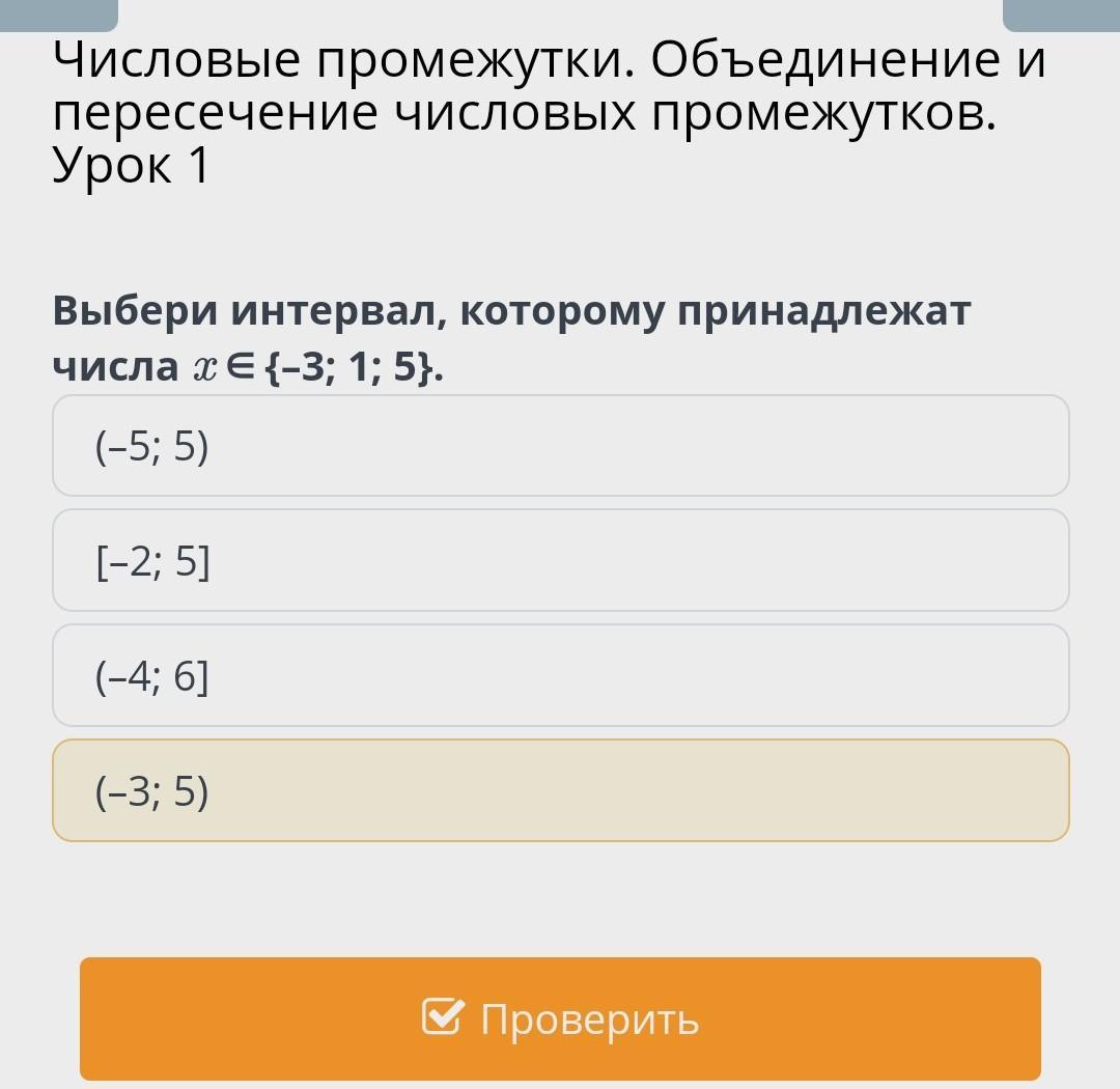 Выбери интервал которому принадлежит числа X€{-3;1;5}.