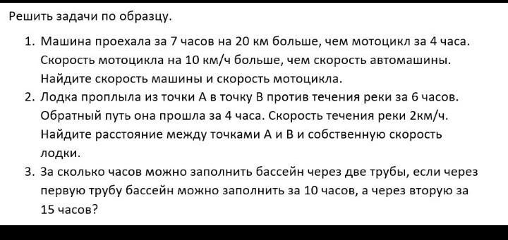 1. Машина проехала за 7 часов на 20 км больше, чем мотоцикл за 4 часа.Скорость мотоцикла на 10 км/ч больше, чем скорость автомашины. Найдите скорость машины и скорость мотоцикла.
