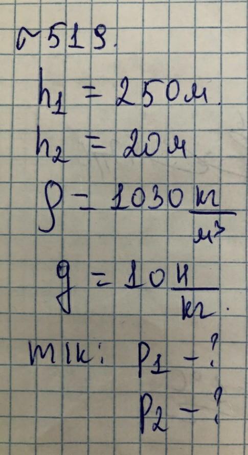 P1 = pgh1 = 1030 кг/м^3 * 10 м/с^2 * 250 м = 2,575 * 10^6 Пa