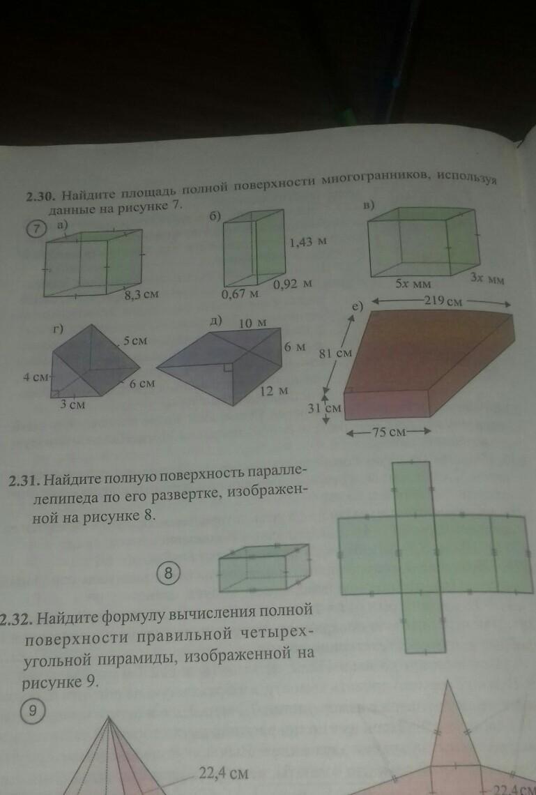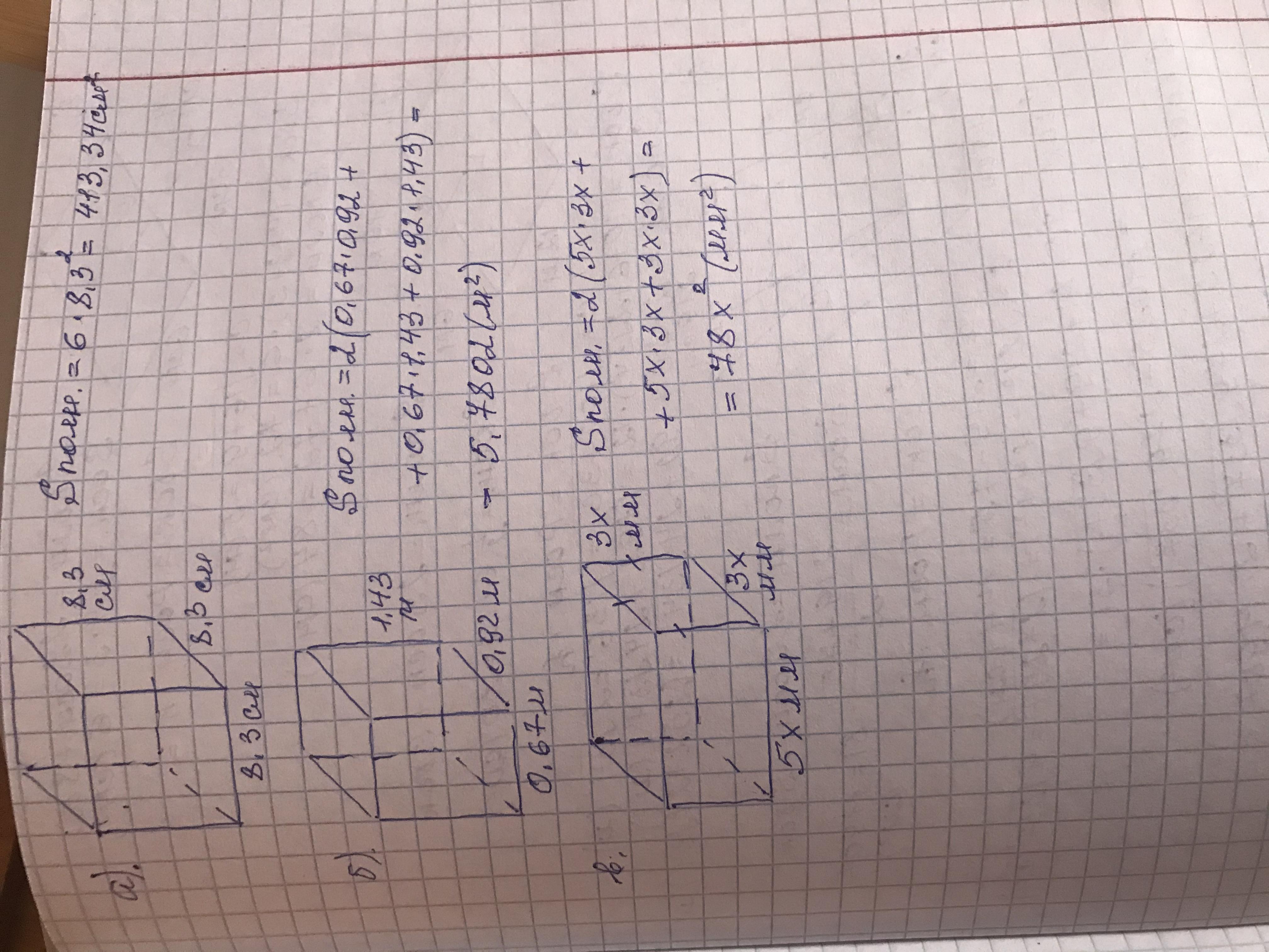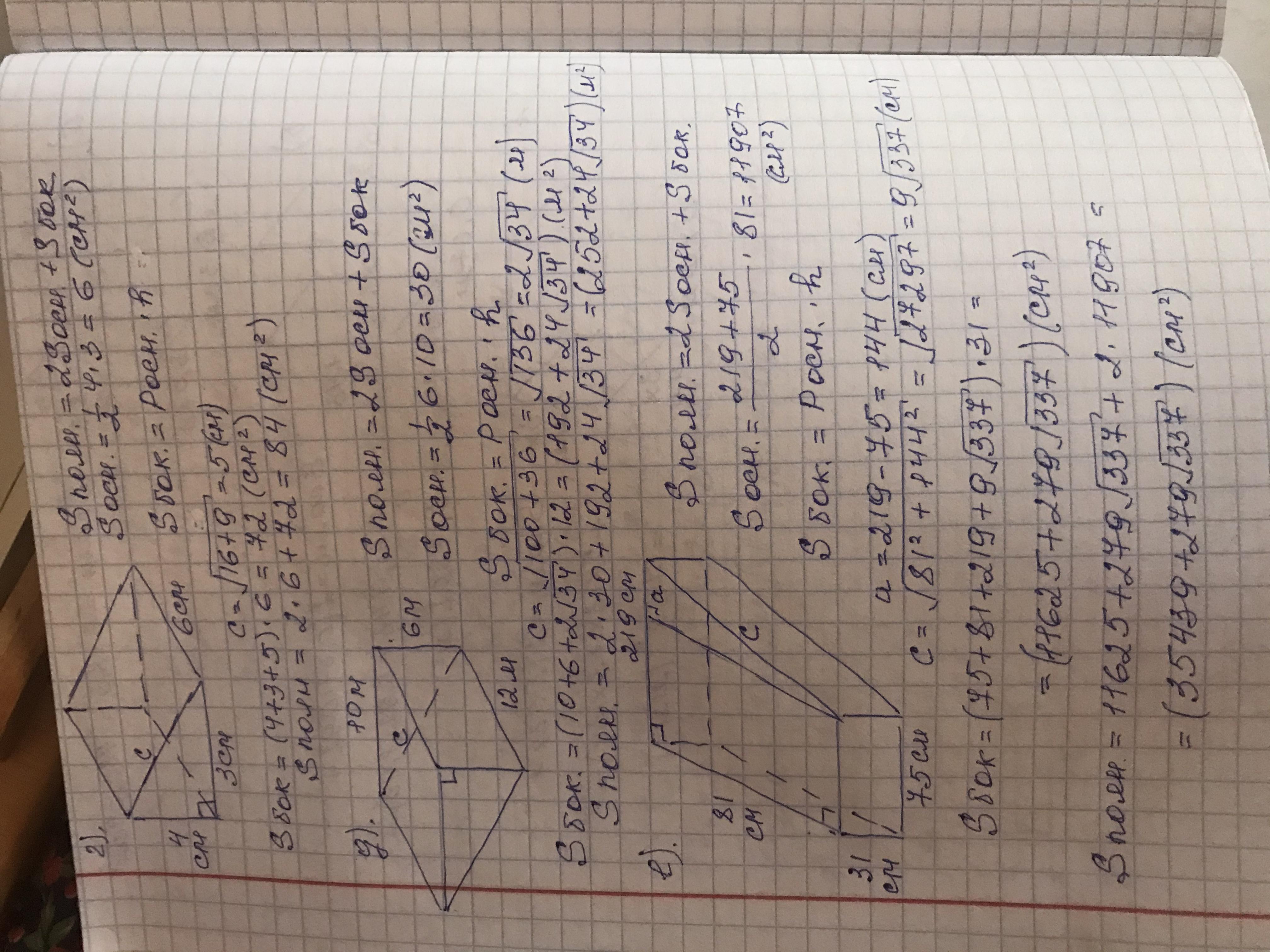 г) Р=3+4+5=12. Sбок=Р*h=12*6=72. Sпол=2Soсн+Sбок=2*3*4/2+72=84